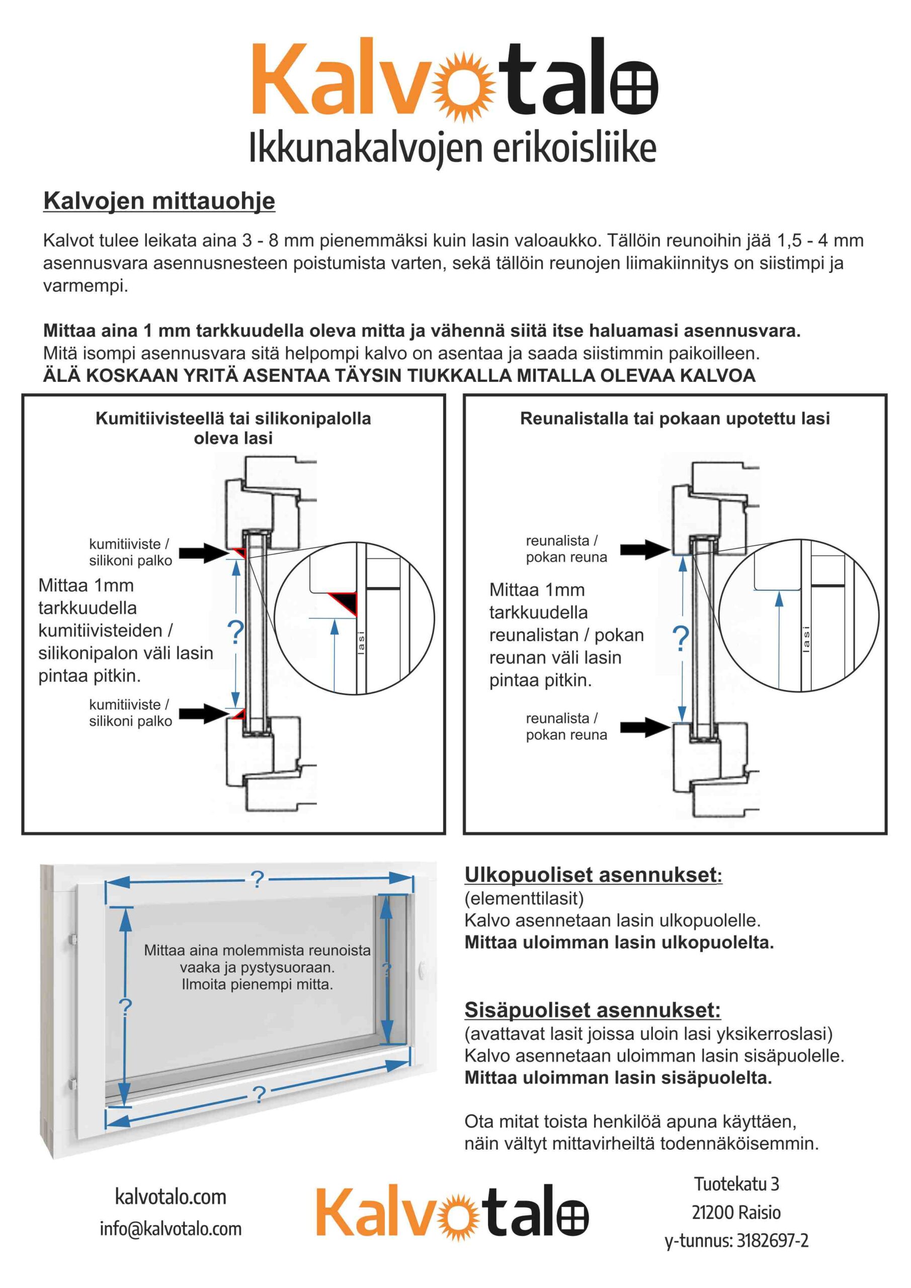 Kalvot leikataan aina 3-8 mm pienemmäksi kuin lasin valoaukko. Tällöin reunoihin jää 1,5 – 4 mm rako asennusnesteen poistumista varten, sekä tällöin reunojen limakiinnitys on siistimpi ja varmempi.